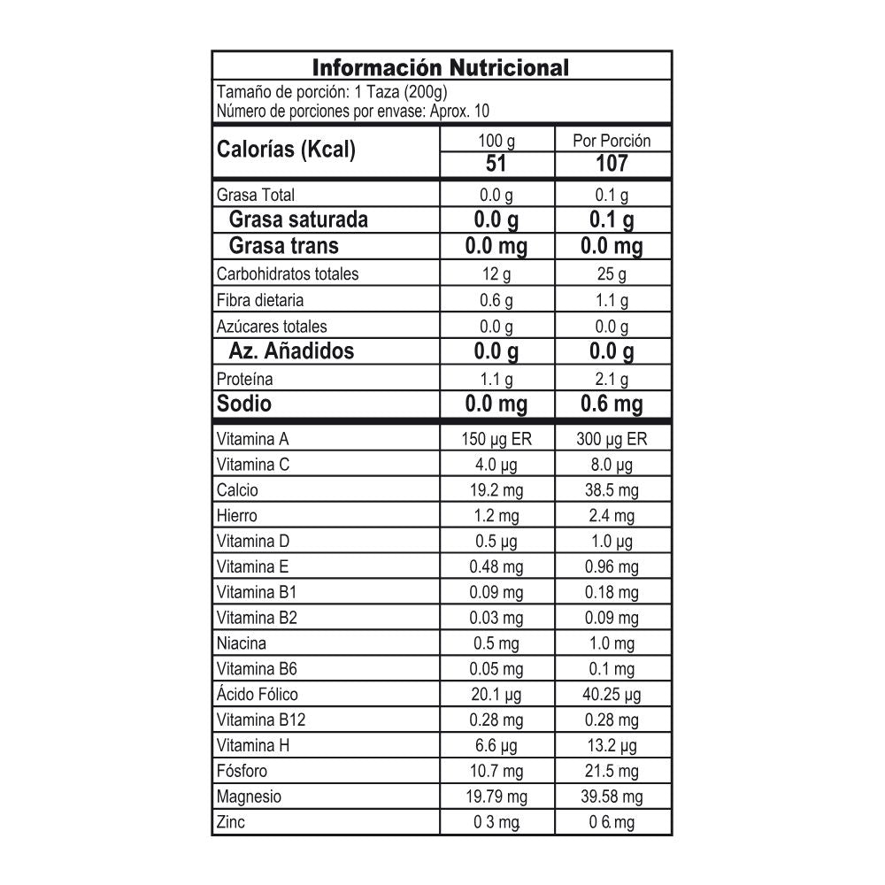 - Fortificado con hierro, zinc, calcio, magnesio y vitaminas A, C, D, E y del complejo B.